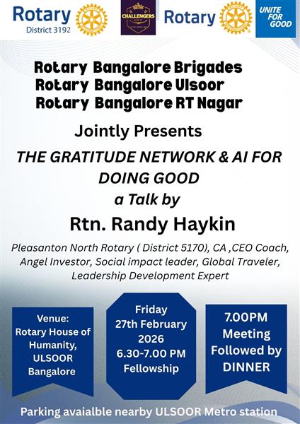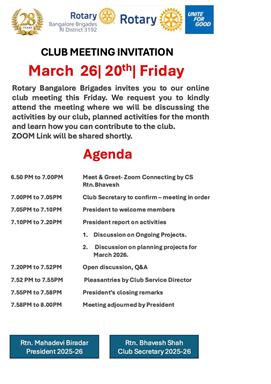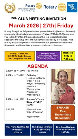 CLUB MEETING INVITATION November 25| 07th| Friday Rotary Bangalor. . .